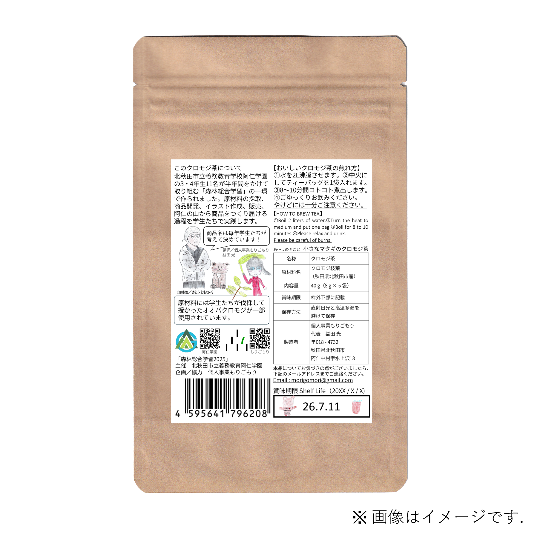 2020年から始まった「森林総合学習」は小学3,4年生の学生たちを対象に行われる独自の学習プログラムです。地域の森林に生えているクロモジという植物を使ったお茶「クロモジ茶」を作るため、春から秋の半年間にかけて、森林の生態を学習、原材料の伐採・加工、イラストデザイン、対面販売など、山から商品を開発し販売するすべての過程を実習します。今年は14名の学生たちとともにオリジナルクロモジ茶をつくりました。商品には学生が伐採して加工したクロモジ茶葉が一部使用されています。
